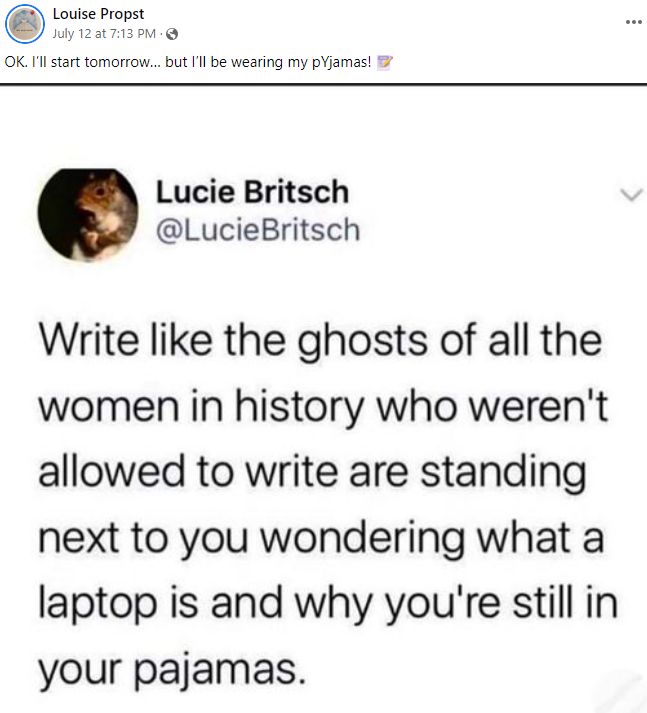 Write like the ghosts of all the women in history who weren't allowed to write are standing next to you wondering what a laptop is and why you're still in your pajamas.