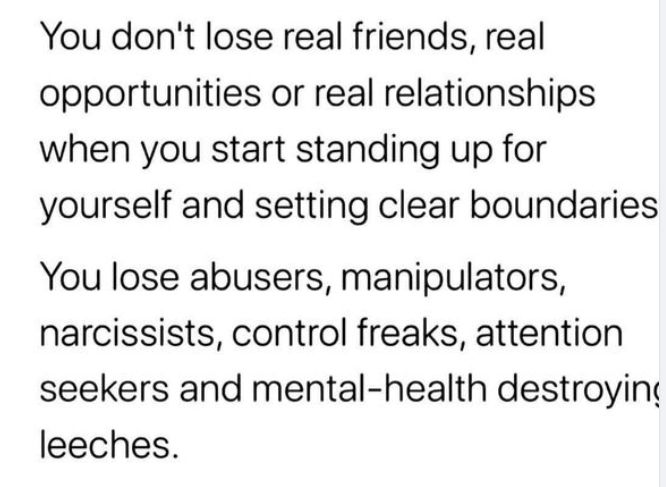 You don't lose real friends, real opportunities or real relationships when you start standing up for yourself and setting clear boundaries. You lose abusers, manipulators, narcissists, control freaks, attention seekers and mental-health destroying leeches.