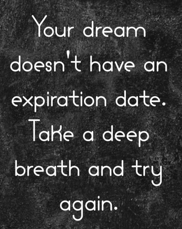 Your dream doesn't have an expiration date. Take a deep breath and try again... and again, an again. You've got everything it takes to have the life of your dreams.