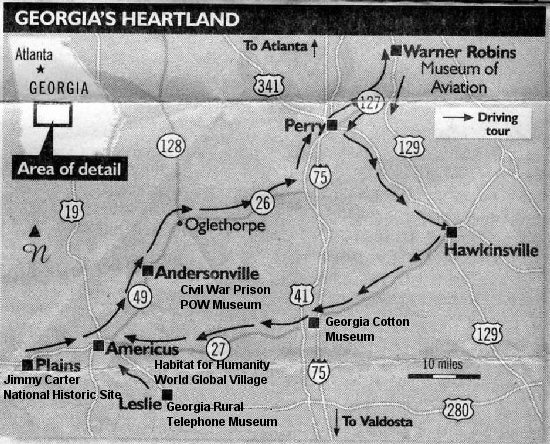 The Andersonville Trail is a 90-mile sight-seeing loop off I-75 in Southwest Georgia. It includes interesting places to visit in Byron, Fort Valley, Warner Robbins, Perry, Marshallville, Montezuma-Oglethorpe, Andersonville, Americus, Plains, DeSoto, Cordele, and Vienna. This site has details on what you can visit in each city: http://www.andersonvilletrail.freeservers.com/.